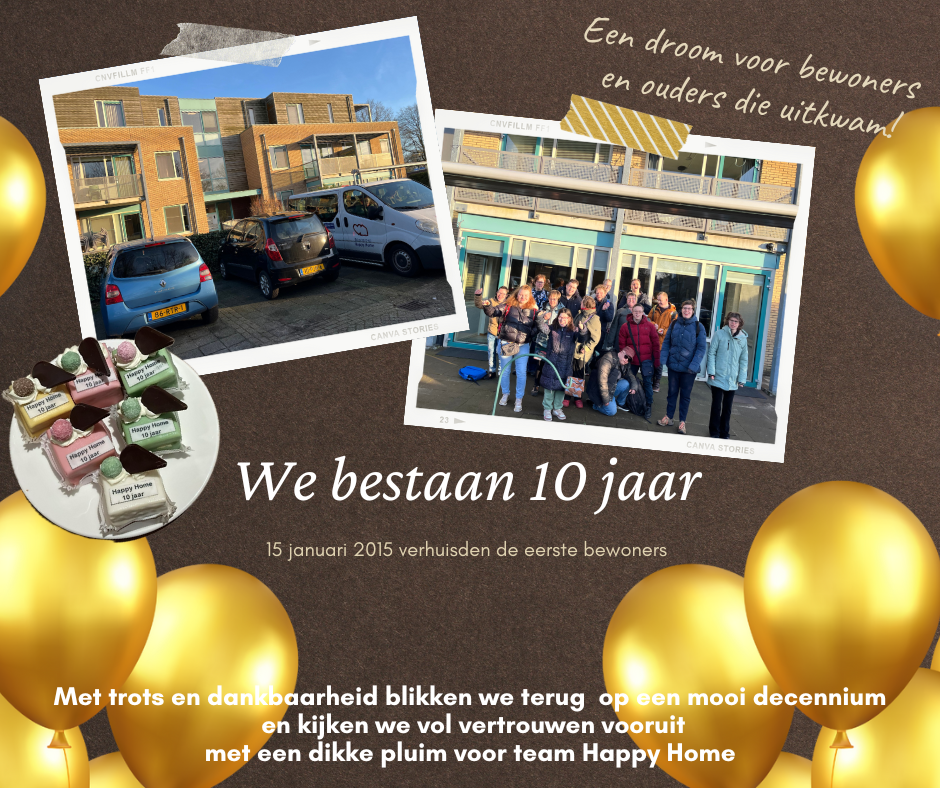 Onder de begeleiding van het Happy Home begeleidingsteam van Amerpoort is er in de afgelopen 10 jaar veel geleerd, zijn er mooie vriendschappen ontstaan en hebben bewoners, team en ouders hun draai gevonden in een fijne samenwerking.
