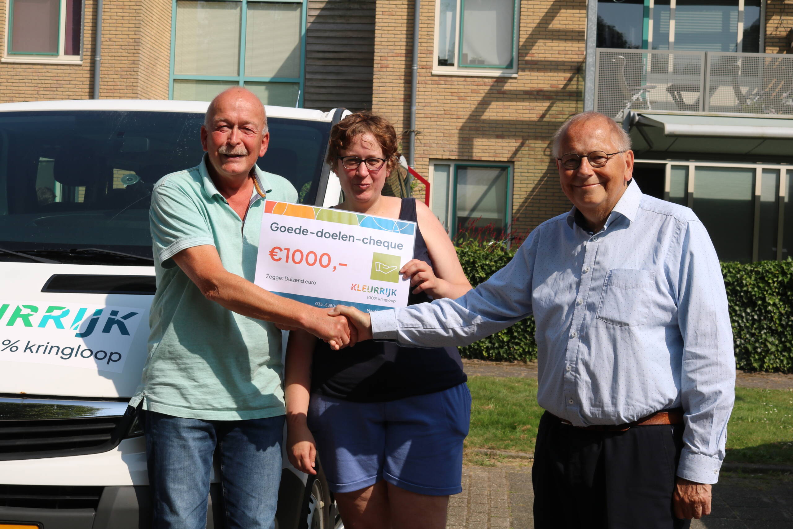 Renze Holwerda, bestuurslid van Fonds Kleurrijk van Kringloop Kleurrijk overhandigt Jan van de Hoef, bestuursvoorzitter van Happy Home en zijn dochter Siri een cheque van € 1000,- . Het is een bijdrage voor onder andere de exploitatie van de Happy Home-personenbus. Renze vertelt de aanwezige bestuursleden en bewoners dat Kringloop Kleurrijk drie doelen na streeft: hergebruik van goederen, sociaal actief zijn door mensen kansen te geven op werk en tenslotte het steunen van goede doelen. Vooral fijn als dat doelen-dichtbij zijn, zoals in dit geval.